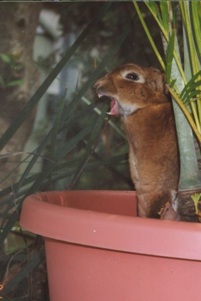 Bubba is very social, loves people, but likes to show his affection by nipping. These razor-sharp teeth really get your attention, especially when he gets your neck. His nipping, beautiful auburn neck ("redneck", get it?) and other crazy antics have earned him the name crazy Bubba. Click on the left picture above to see him trashing the kitchen with his litterbox and chewing on the gate. The right picture looks like he's ready to attack, but click on the picture and you'll see he's just yawning while relaxing in a favorite flower pot.