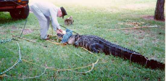 he can be tied, Joe places a towel of the gator's eyes so he won't struggle.