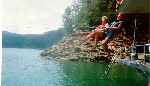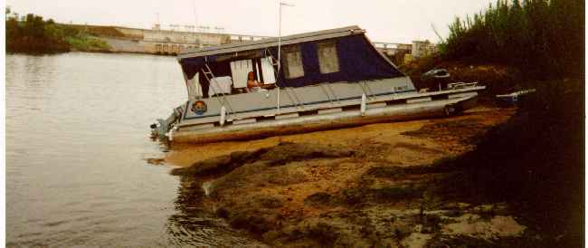 So we slept at a 30 degree angle that night - Sparky and Benny, too. The hydroelectric dam had shut down, so the water level went down six feet. We were told that they would start generating (and letting water out) the next morning at 11 AM. This was frustrating since the locks opened at AM and we were stuck.