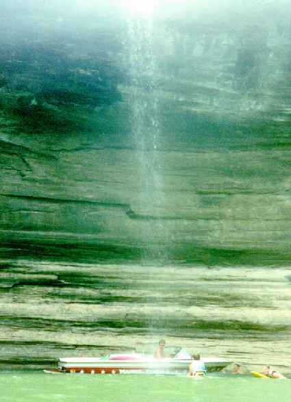 Paul settles for driving the boat under the waterfall to cool off. Yes, the boat has a